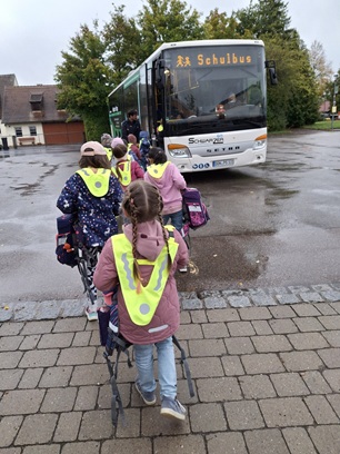 Mit großer Aufregung versammelten sich unsere neuen Erstklässlerinnen und Erstklässler in der Aula, um gemeinsam mit Polizist Herrn Buser das diesjährige Schulbustraining zu absolvieren.