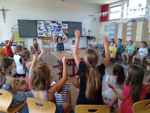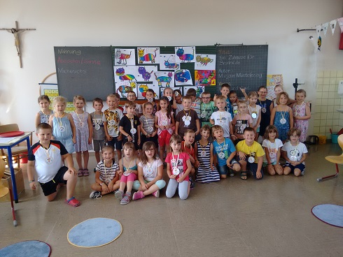 Nach einem spannenden und lehrreichen Jahr voller Experimente zu den Themen Luft, Wasser und Sinne, fanden sich alle AGler (Vorschüler und Erstklässler) zu einer gemeinsamen Abschlussstunde in der Schule ein. Nach einem kurzen Austausch, welche Experimente denn die interessantesten waren, ging es mit den letzten beiden Versuchen los. Zunächst wurde die Teebeutelrakete in die Luft geschickt und anschließend ein Vulkan zum Ausbruch gebracht. Als kleine Anerkennung für das fleißige Kommen und Mitforschen erhielt jedes Kind zum Schluss eine Forschermedaille und eine süße Belohnung. Hoffentlich bleibt das eine oder andere Experiment in Erinnerung und lädt zum weiteren Forschen ein ...