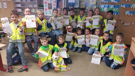 Bereits beim Schulbustraining am Anfang des Schuljahres haben wir gelernt, wie wichtig es ist besonders in der nun dunklen Jahreszeit mit Sicherheitsweste unterwegs zu sein, weil sie uns einfach mehr Sichtbarkeit bietet. Ein dunkel gekleidetes Kind wird nämlich erst aus 25 Metern erkannt, ein Kind mit Sicherheitsweste jedoch bereits aus 140 Metern. Es ist also ganz schön helle stets mit Weste unterwegs zu sein. Vier Wochen lang haben wir in unserer Klasse jeden Tag fleißig darüber Buch geführt und als Nachweis und Ansporn für das tägliche Tragen hat jeder Schüler ein Häkchen auf einem Aktionsposter gemacht. Zur Belohnung gab es einen Felix und Frieda Verkehrsdetektiv-Ausweis für jedes Kind und eine Urkunde. Nun heißt es nur noch abwarten und hoffen, dass wir bei der großen Verlosung auch noch einen tollen Preis gewinnen. Vielleicht haben wir ja Glück