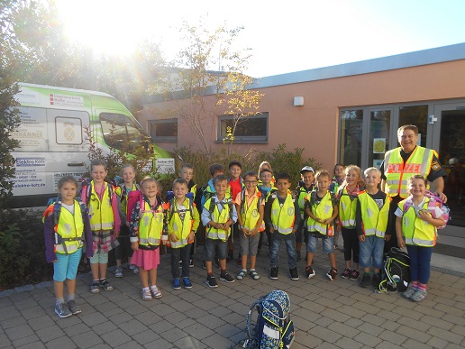 Gleich am zweiten Schultag stand für uns Erstklässler das Schulbustraining mit Herrn Berger von der Jugendverkehrsschule auf dem Programm. Wir lernten und übten ganz wichtige Dinge wie das Ein- und Aussteigen, das Verhalten im Schulbus und an der Bushaltestelle und auch das sichere Überqueren der Straße. Wie gut wir mit unseren nagelneuen hellleuchtenden Warnwesten vom ADAC gerade in der nun nahenden dunklen Jahreszeit gesehen werden, führte uns der Polizist sehr anschaulich vor Augen. So sind wir nun also besonders morgens als Verkehrsdetektive sehr sicher unterwegs.