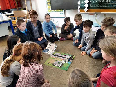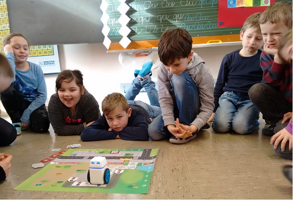 KUBO ist ein kleiner Roboter, dessen Laufwege man mit TagTiles progammieren kann. In kurzer Zeit werden die Grundlagen vom Kodieren und Programmieren vermittelt. Das Anlegen von Routen und auch das Erstellen von Loops können mit KUBO gelernt werden. Auf dem Bild seht Ihr die Kinder der 2. Klasse, die mit KUBO arbeiten. Es war so spannend für alle, dass höchste Konzentration herrschte und alle gebannt waren, wie sie KUBO steuern konnten. Die Schüler benutzen dazu TagTiles und Funktionen und können so immer weiter in die verschiedenen Programmierebenen eindringen. Auch die 3. Klasse hat schon fleißig programmiert und KUBO von der Bushaltestelle zur Schule geschickt, zur Turnhalle oder zum Bäcker. Und die Schüler haben KUBO so programmiert, dass er die überlegten Strecken lernen und wieder abspielen kann. Bald werden wir mit 5 KUBOs arbeiten und bedanken uns schon mal sehr herzlich bei unserem Sponsor der Firma AiNeW Anlagen- und Gebäudeautomation.
