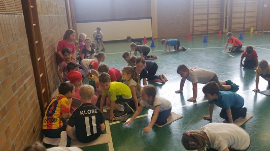 Jede Menge Mut mussten die kleinen Piraten aufbringen, als sich die Erst- und Zweitklässler mit den Vorschülern zur Sportstunde trafen. Diesmal lud die aufgebaute Bewegungslandschaft auf eine Pirateninsel ein. Beim gemeinsamen Piratentanz probierten wir gleich einmal aus, was Piraten so alles können müssen beim Rudern, Segeln und Fische fangen auf hoher See…! Da den Piraten ihre Insel irgendwann zu klein wurde, ruderten sie „auf Teppichfliesen“ an Land und fanden dort eine Flaschenpost von ihrem Piratenkapitän und eine Schatzkarte. Bevor aber die versprochene Schatzkiste wartete, sollten die kleinen Seeräuber erst jede Menge Abenteuer meistern und beweisen wie mutig und tapfer sie sind. Es musste z. B. ein Schiffsmast erklommen werden, ein Krokodilsumpf, eine Schlucht und eine Hängebrücke überquert werden oder auch eine Schlangengasse durchfahren und Fracht an Bord geschafft werden. Nachdem die Schatzkarte von den schlauen kleinen Piraten schnell gelesen war, wurden Späher ausgesandt, um die Schatzkiste zu suchen. So ließ die ersehnte Belohnung in Form von Schokoladengoldtalern nicht lange auf sich warten und ein fröhliches Zusammentreffen, bei dem alle viel Spaß hatten, ging wieder einmal viel zu schnell zu Ende.