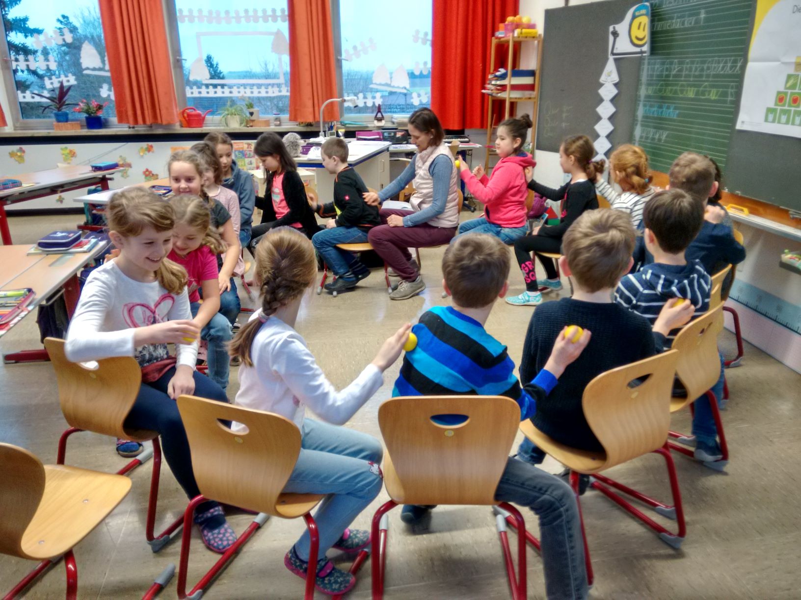 Konkrete Beispiele zur Entspannung erfuhren die Kinder dann am eigenen Leibe durch die Klaro-Kugel – einem Knautschball, den man auch zur Massage nützen kann. Nachdem jedes Kind eine Kugel erhalten hat, durften sie sich selber und gegenseitig massieren. Sehr angenehm!