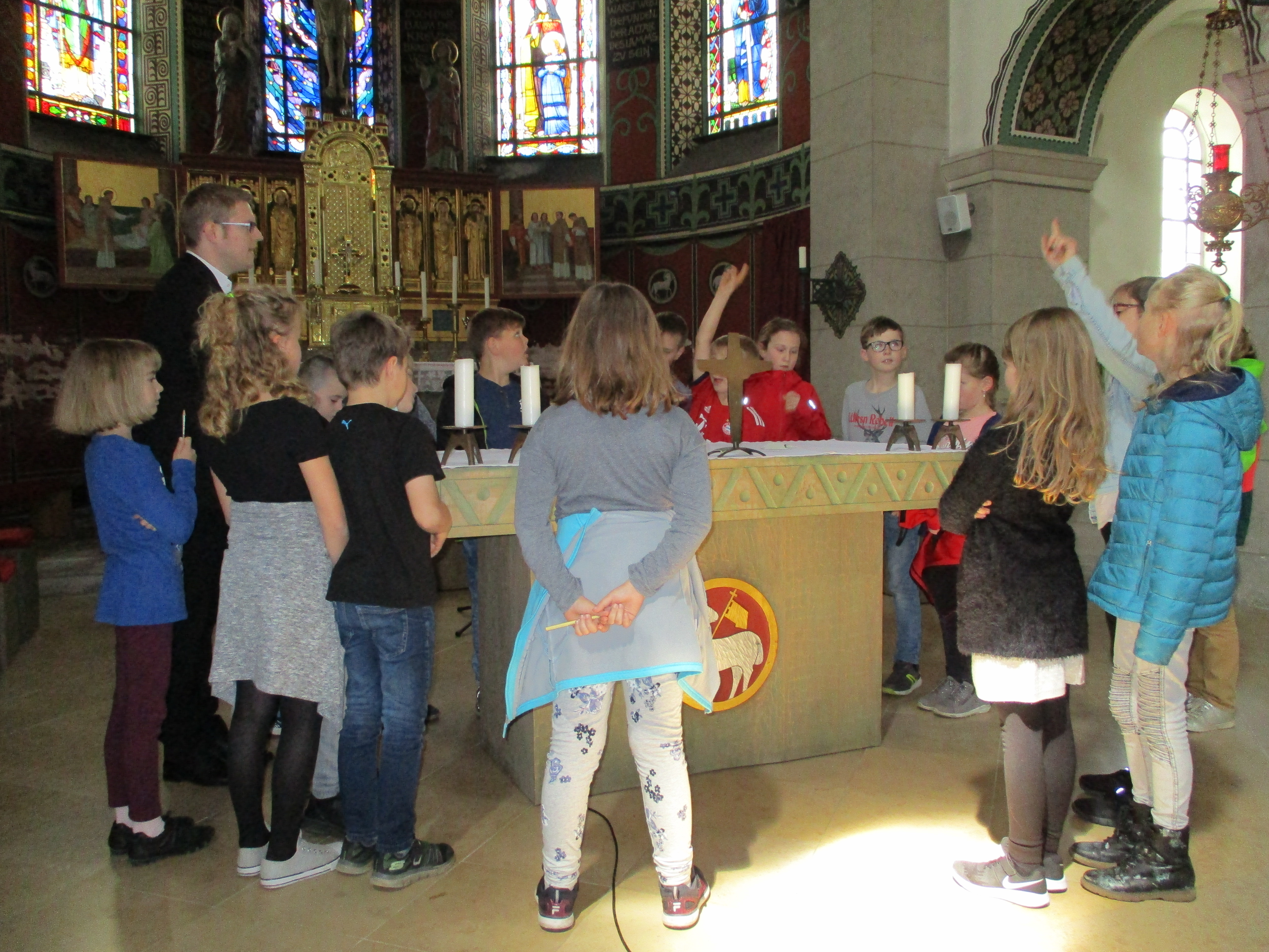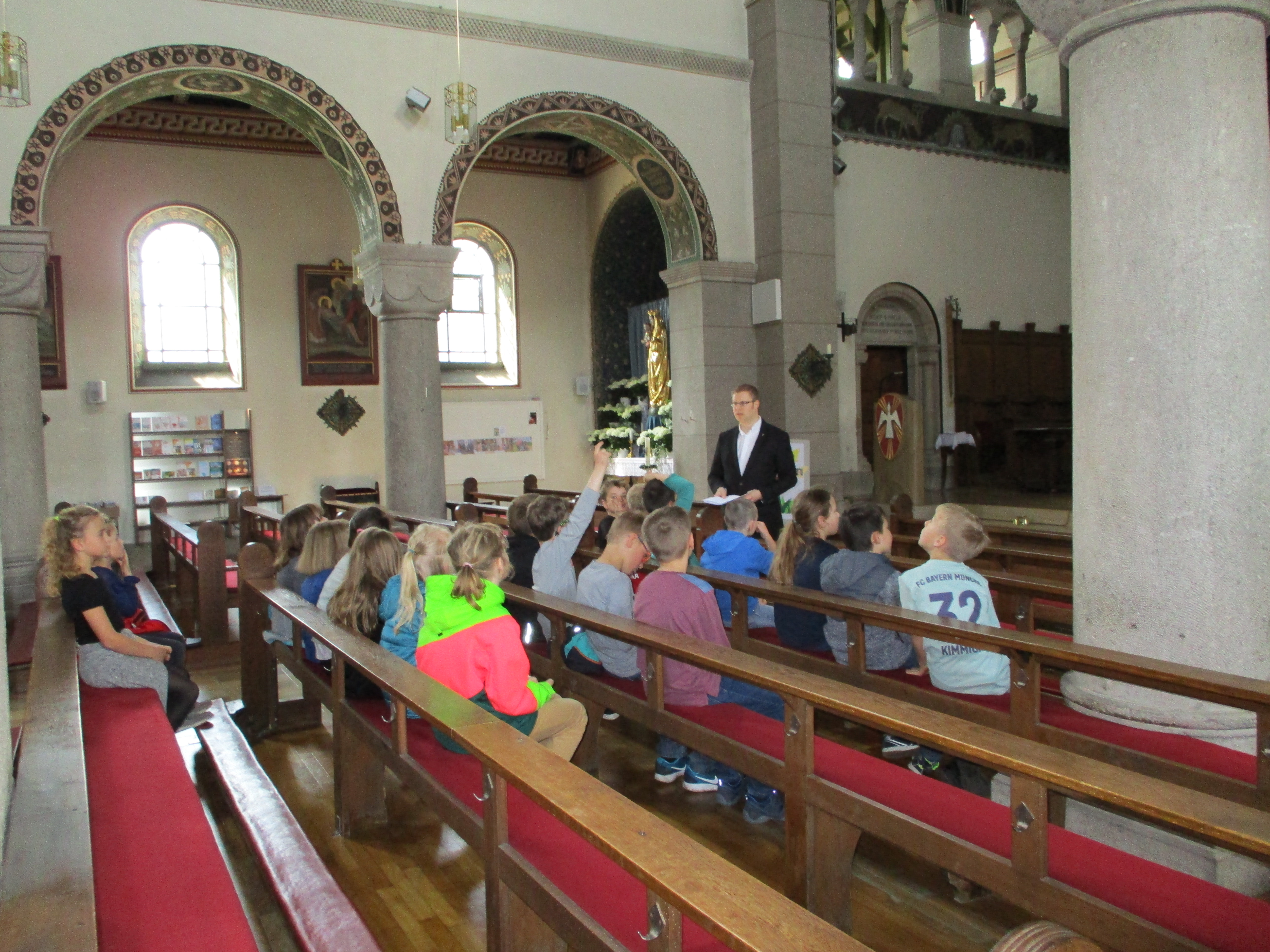 Im Rahmen des Religionsunterrichtes besuchte die 3. Klasse die Pfarrkirche St. Gallus und bekam schon die zweite Führung durch Pfarrer Michael Kammerlander: Im Rahmen der Heimatkunde lernten die Schüler manche Besonderheit der Kirche kennen. Diesmal lag der Schwerpunkt auf der Kirche als Gottesdienstraum. Viele Fragen zur Dekoration konnten beantwortet werden, sowie neues Wissen zu den liturgischen Orten erworben werden. Besonders der Taufstein wurde begutachtet. Ein kleines Geheimnis wurde den Kindern verraten: der Großvater von Bischof Konrad wurde an diesem getauft. Zum Abschluss gab es ein Quiz, das aufmerksame Kinder gut lösen konnten.