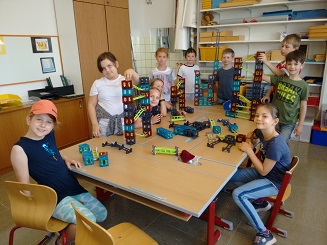 Die Zweitklässler beschäftigen sich momentan in HSU begeistert mit dem Thema „Bauen und Konstruieren“. In kleinen Gruppen lösen sich verschiedene Aufgaben rund um die Standfestigkeit selbst gebauter Mauern und Türme aus Holzbausteinen. Spielerisch erfahren sie so etwas über die Prinzipien der Standfestigkeit. Besonders spannend ist natürlich auch die Weiterführung mit der Kugelbahn, wo das Bewegungsverhalten rollender Objekte untersucht wird.