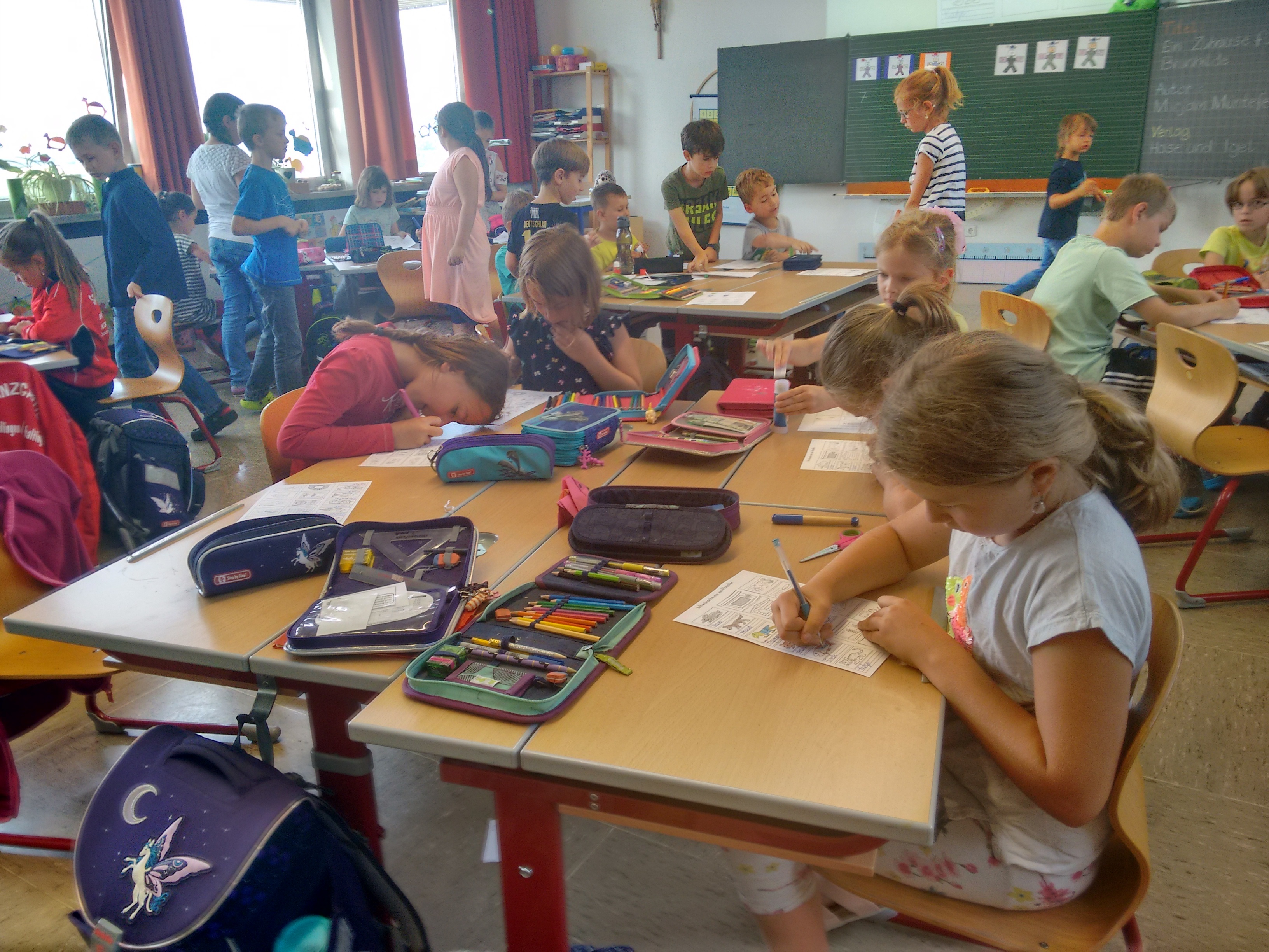 Wie jedes Jahr wurden auch heuer die Vorschüler in den letzten Wochen des Schuljahres zum Schnupperunterricht in die Schule eingeladen. Von Grundschülern abgeholt durfte jedes Kind schon einmal den Weg zur Schule zu Fuß oder mit dem Bus „ausprobieren“. Nach dieser gemeisterten ersten Aufgabe wurden die Kleinen auf die erste und die zweite Klasse aufgeteilt und durften sich im jeweiligen Klassenzimmer einen Platz suchen. Ein kleiner Begrüßungskreis half, die erste Scheu und Aufregung abzubauen. Dann ging es auch schon los mit „richtigem Unterricht“! Fleißig wurde in beiden Klassen im „Land der Mathener“ gerechnet und Würfelpunkte zusammengezählt. Natürlich war zwischendurch eine Bewegungspause nötig, um wieder konzentriert weiterarbeiten zu können. Die eine Gruppe las außerdem eine Geschichte, in der die kleine Maus einen Freund sucht. Die anderen trugen ihr Wissen über Haustiere zusammen und überlegten, welche Nahrung und Behausung welches Tier benötigt. Mit einem (Tanz-)Lied endete dieser erste „richtige“ Unterricht und die Vorschüler durften ihre erste große Pause im Schulhof verbringen, bevor sie zum Kindergarten zurück gebracht wurden.