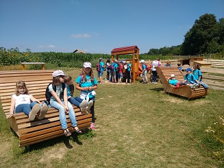 Außerdem hatten wir genug Zeit eingeplant, um in der restlichen Zeit diesen Teil der Gartenschau in Ruhe anschauen zu können. Also wurde der fast einen Kilometer lange goldene Steg von der Seerose bis zur Bergrose abgelaufen, im Wald auf verschiedenen Holzstämmen balanciert, der Imkerwagen inspiziert und natürlich die gemütlichen Hängesessel ausprobiert. Beim Landwirtschaftsstand durften wir sogar versuchen, eine (fast echte) Kuh zu melken, uns im „Kartoffelkloß-Weitwurf“ beweisen, Butter selber schütteln (um dann Butterbrote serviert zu bekommen) und natürlich Station beim „Bett im Kornfeld“ zu machen.