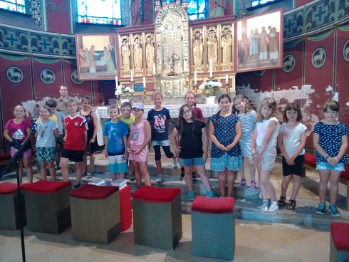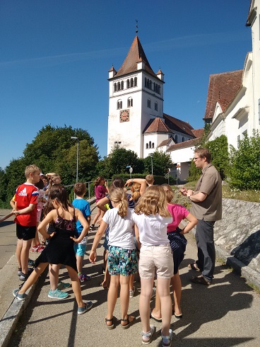 Gleich am nächsten Tag machten sich die Zweitklässler wieder auf den Weg, ihren Heimatort zu erkunden. Diesmal stand die Pfarrkirche St. Gallus auf dem Plan. Nachdem wir dort ja bereits einige gemeinsame Gottesdienste verbracht hatten, wollten wir ein bisschen mehr über die Kirche erfahren. Herr Pfarrer Kammerlander erklärte uns viele interessante Dinge zur Geschichte, zum Bau und zur Ausstattung des prächtigen Gotteshauses. So erfuhren wir zum Beispiel, dass es über hundert Jahre alt ist und gebaut wurde, weil die alte Kirche zu klein war. Pfarrer Josef Eisele war damals Pfarrer in Fremdingen. Berühmte Künstler jener Zeit schmückten die Kirche aus. Der prächtige Hochaltar ist aus Suevit und zeigt Heilige in Deutschland, darunter auch St. Gallus, der oft mit einem Bären abgebildet ist. Auch von außen ist das Gebäude sehr markant und erinnert an eine Burg. Wir freuen uns schon auf unseren Abschlussgottesdienst dort am Freitag!
