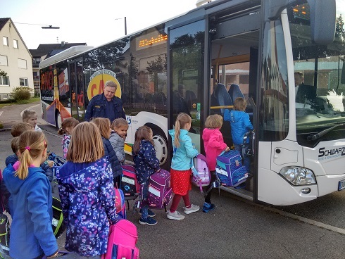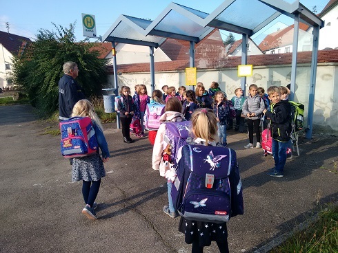 Dazu bekamen sie Besuch von dem Polizisten Herrn Berger. Zunächst erklärte dieser den Kindern in der Aula einige wichtige Grundlagen zum Straßenverkehr für Fußgänger und Buskinder. Anschließend gingen sie nach draußen, wo bereits ein Schulbus bereit stand. Hier erklärte der Polizist ganz genau, was die Kinder beim Ein- und Aussteigen des Busses beachten müssen, damit nichts passiert. Besonders wichtig ist natürlich, dass NIEMAND vor oder hinter dem haltenden Bus über die Straße läuft. Auch auf das richtige Verhalten im Bus ging Herr Berger ein. Als Höhepunkt der Sicherheitsaktion durfte jetzt die ganze Klasse eine Runde durch die anliegenden Dörfer fahren. Jedes Kind konnte so an einigen Haltestelle mehrfach das richtige Ein- und Aussteigen üben. Auch die Fremdinger Kinder fanden es toll, einmal mit dem Schulbus fahren zu können.