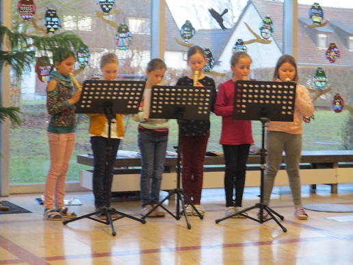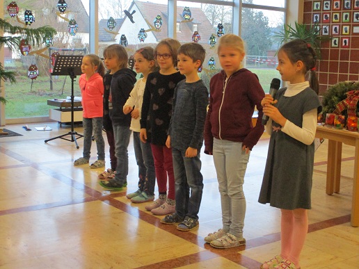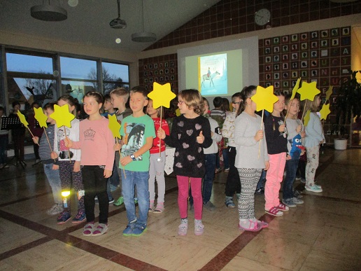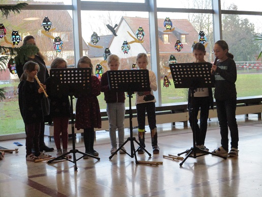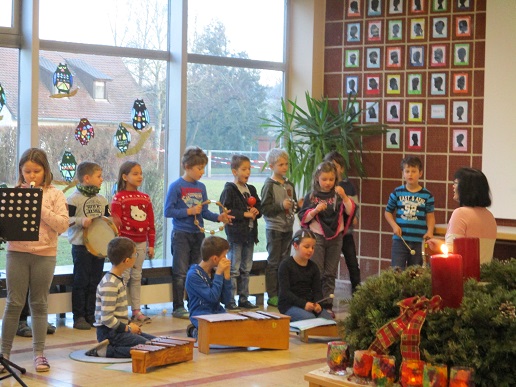 Nach dem dritten Advent konnten wir gestern unsere stimmungsvolle Adventsfeier in der Aula begehen. Alle Klassen hatten Beiträge vorbereitet und erfreuten damit nicht nur ihre Mitschüler und Lehrer, sondern auch zahlreiche Eltern, die der Einladung gefolgt waren und zu uns in die Schule gekommen waren. Die Flötengruppe von Herrn Reichherzer begleitete unseren Start: Wir sagen Euch an, den lieben Advent und auch die erste und zweite Klasse schmückte das Lied mit einem passenden Lichtertanz. Nach einer kurzen Begrüßung von Rektorin Faußner-Härtle, las uns die 4. Klasse mit Frau Meier eine besondere Weihnachtsgeschichte von Anja vor und zeigte uns dazu Bilder auf der Leinwand. Anschließend hörten wir Jingle Bells von der Flötengruppe. Die 1. Klasse mit Frau Nagler trug ein schönes Weihnachtsgedicht vor und die 2. Klasse mit Frau Wizinger begleitete uns beim Singen von Eine Kerze leuchtet weit wunderschön mit den Orff-Instrumenten. Was drei Räuber machen, wenn sie in den Stall vom Jesus-Kind stürmen, zeigte uns die 3. Klasse mit Frau Deißler und spielte uns die Weihnachtsgeschichte einmal etwas anders vor. Die Flötengruppe der 1. Klasse mit Frau Vierkorn konnte uns auch schon ein Weihnachtslied vorspielen.