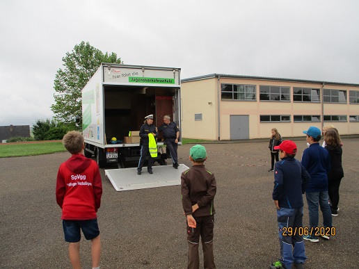 Zu Beginn konnten die Kinder die Bereiche des toten Winkels bei einem LKW erkennen, indem sie sich selbst rechts/ links wie auch vorne und hinten an den LKW stellen durften und überprüft wurde, ob der Fahrer sie im Spiegel sehen kann. Die Gefahrenstellen wie auch das richtige Verhalten im Straßenverkehr bei einer Kreuzung wurden von Herr Berger ausführlich thematisiert. Um schnell im Straßenverkehr erkennbar zu sein, ist die richtige Kleidung wie helle Farben und Reflektoren entscheidend. Das Tragen eines Helms zum eigenen Schutz wurde den Schülerinnen und Schülern durch das Erzählen von verschiedenen Unfallsituationen sehr einprägend bewusst gemacht. Der abschließende Versuch, dass ein rohes Ei im freien Fall durch den Fahrradhelm geschützt bleibt, zeigte den Kindern, welche enorm wichtige Schutzfunktion der Helm trägt und somit Leben retten kann.