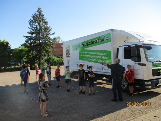 Aufgrund der Coronalage wurde für die entfallene praktische Fahrradausbildung die Möglichkeit geschaffen, dass die Polizei Nördlingen an die Schule kommt und die Themen toter Winkel wie auch Erkennbarkeit im Straßenverkehr realitätsnah erklärt.