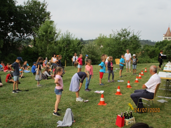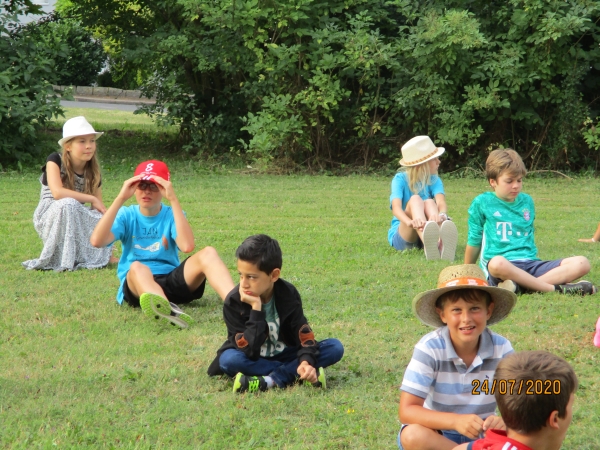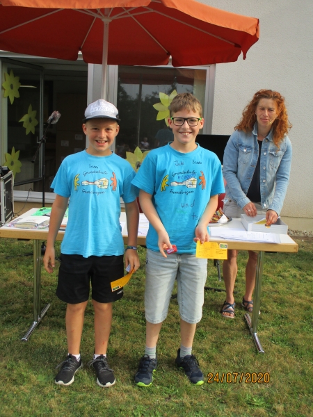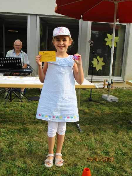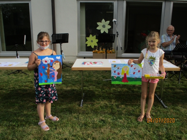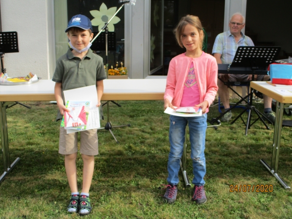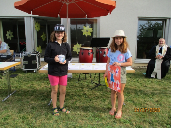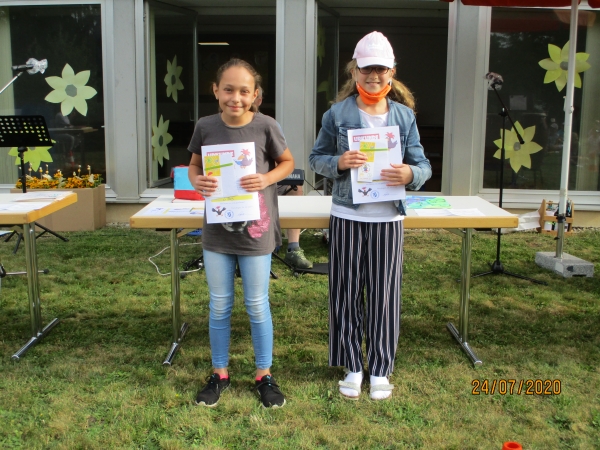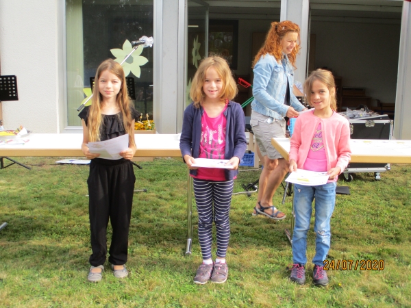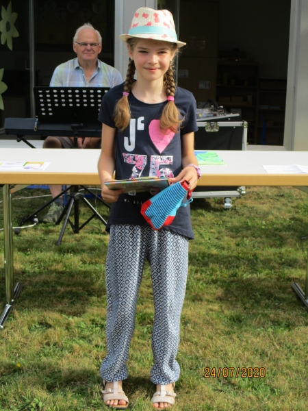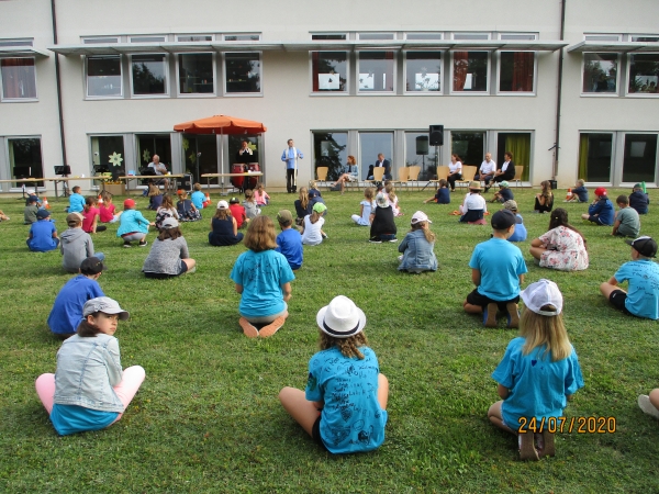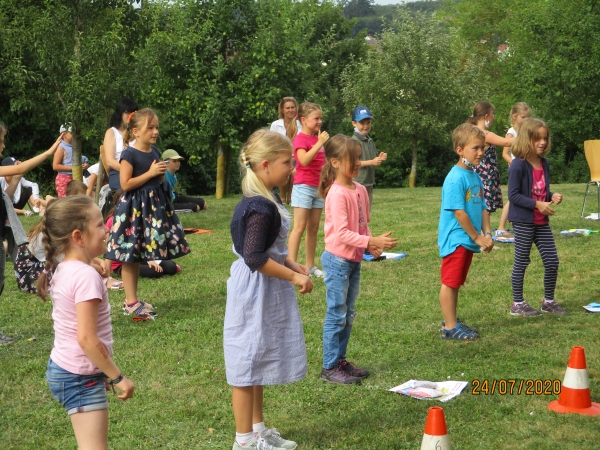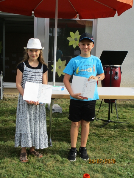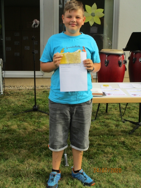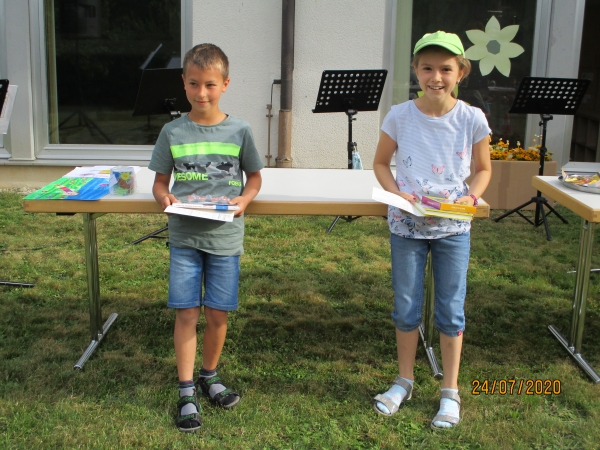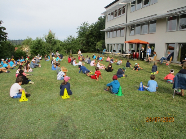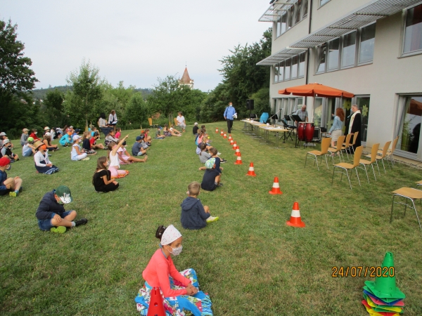 Eine etwas andere Andacht feierten wir am letzten Schultag. Wir konnten gemeinsam draußen auf der Wiese mit Pfarrer Layh und Pfarrer Kammerlander hinter dem Schulhaus beten und singen. Das Wetter machte gut mit und es wurde nicht zu heiß, so konnten wir anschließend unsere Ehrungen durchführen. Die besten Leser im Antolin-Online-Programm wurden ausgezeichnet, die besten Sportler beim Gerätturnen, die Sieger des Malwettbewerbes und die Gewinner des Luftballonwettbewerbs konnten geehrt werden. Sie erhielten Sachpreise, Bücher und Büchergutscheine oder eine kleine Süßigkeit.