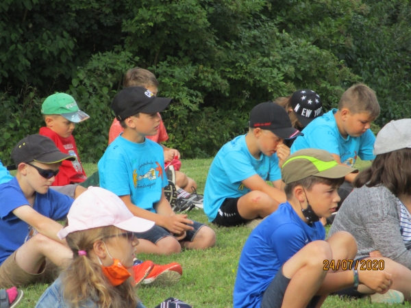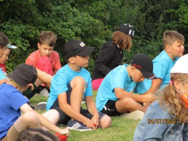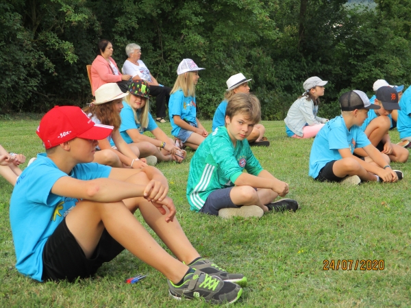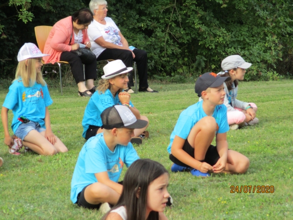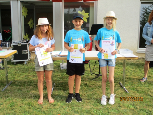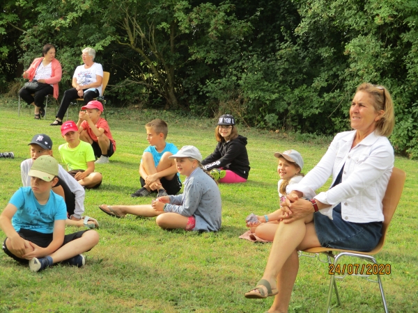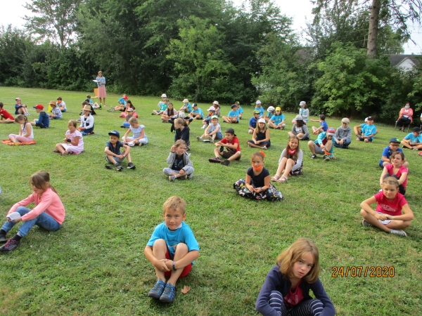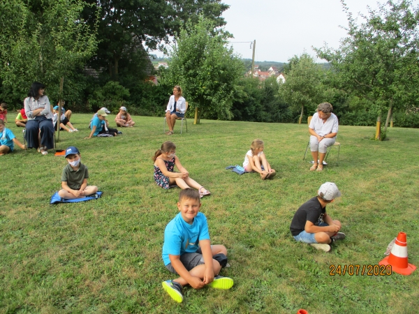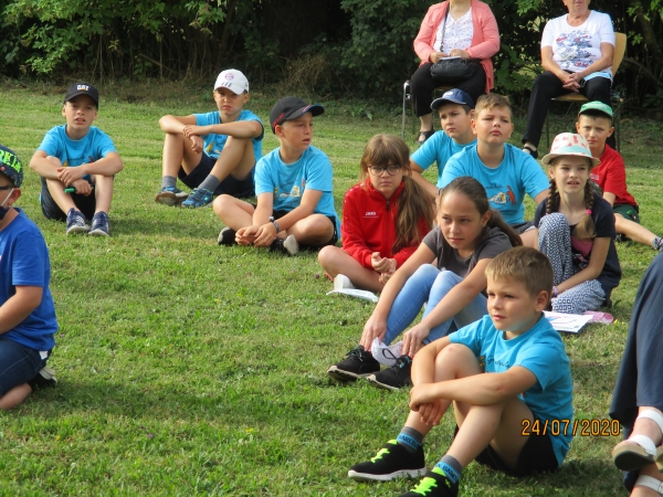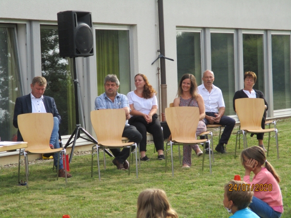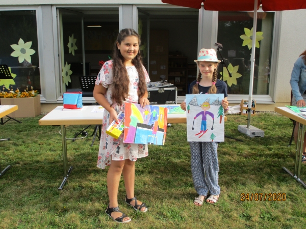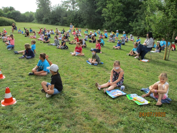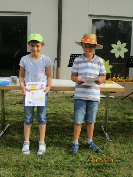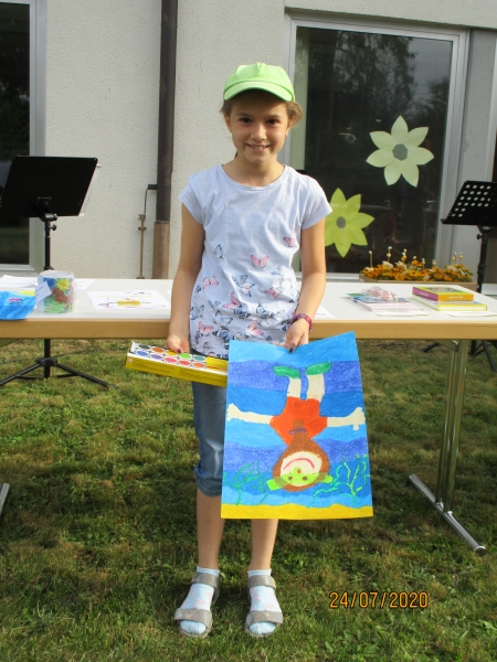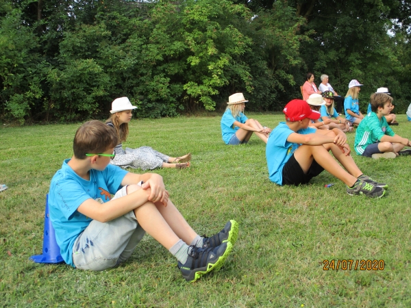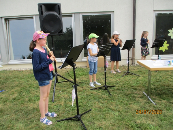 Eine etwas andere Andacht feierten wir am letzten Schultag. Wir konnten gemeinsam draußen auf der Wiese mit Pfarrer Layh und Pfarrer Kammerlander hinter dem Schulhaus beten und singen. Das Wetter machte gut mit und es wurde nicht zu heiß, so konnten wir anschließend unsere Ehrungen durchführen. Die besten Leser im Antolin-Online-Programm wurden ausgezeichnet, die besten Sportler beim Gerätturnen, die Sieger des Malwettbewerbes und die Gewinner des Luftballonwettbewerbs konnten geehrt werden. Sie erhielten Sachpreise, Bücher und Büchergutscheine oder eine kleine Süßigkeit.