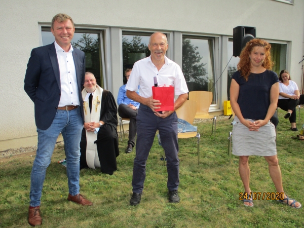 Abschließend haben wir noch einen Sprechgesang "Herr Reibers Tätigkeiten" und ein Ständchen "Der Karl got in Ruhestand" für unseren Hausmeister vorbereitet, der nach 28 Jahren an der Schule in den verdienten Ruhestand gegangen ist! Dazu waren auch der Bürgermeister, Mitglieder des Schulverbandes, die Leitung des Kindergartens und der Elternbeirat gekommen. Der Bürgermeister sprach lobende und dankende Worte an Herrn Reiber und überreichte ihm auch ein Geschenk. Natürlich haben wir ihm auch unser Geschenk überreicht, das in toller Zusammenarbeit aller Schüler und aller Lehrer erstellt wurde! Wir hoffen darauf, dass er dort sitzend viele schöne Stunden in seinem Ruhestand verbringen kann und freudig an uns zurückdenkt!