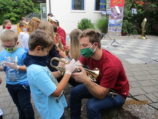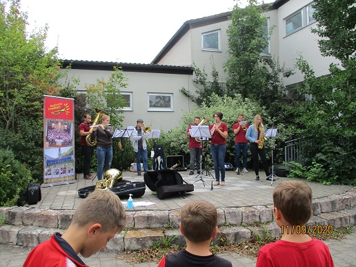 Gleich die erste Musikstunde im neuen Schuljahr sollte für die 21 Drittklässler eine ganz besondere sein. Am Freitag, den 11. September versammelten sich die Schülerinnen und Schüler auf dem Pausenhof, um einem kleinen Standkonzert zu lauschen. 7 Musikanten des MV Fremdingen waren zu Besuch gekommen, um ihre Blasinstrumente vorzustellen. Nach einer klanglichen Kostprobe erhielten die interessierten Kinder Infos zu den einzelnen Instrumenten und einer möglichen Ausbildung im Musikverein. Unter Coronabedingungen mit Mundschutz und Handschuhen konnten die Instumente nun aus nächster Nähe kennengelernt und angefasst werden. Geduldig erklärten die Musikanten das richtige Halten und beantworteten Fragen der Schülerinnen und Schüler. Nach einem Abschlussstück bedankten sich alle Kinder mit einem kräftigen Applaus für diese tolle "außerschulische" Unterrichtsstunde.