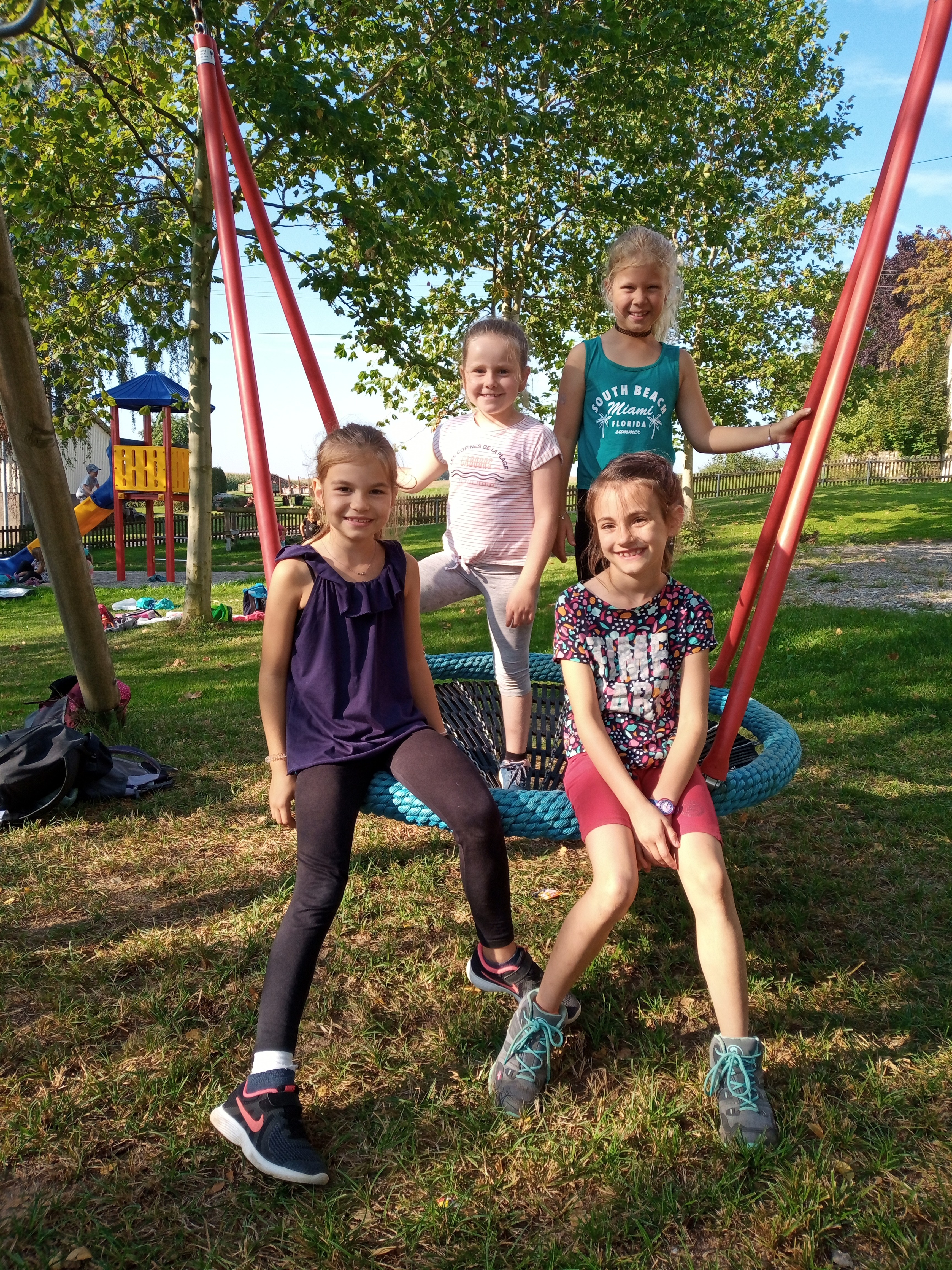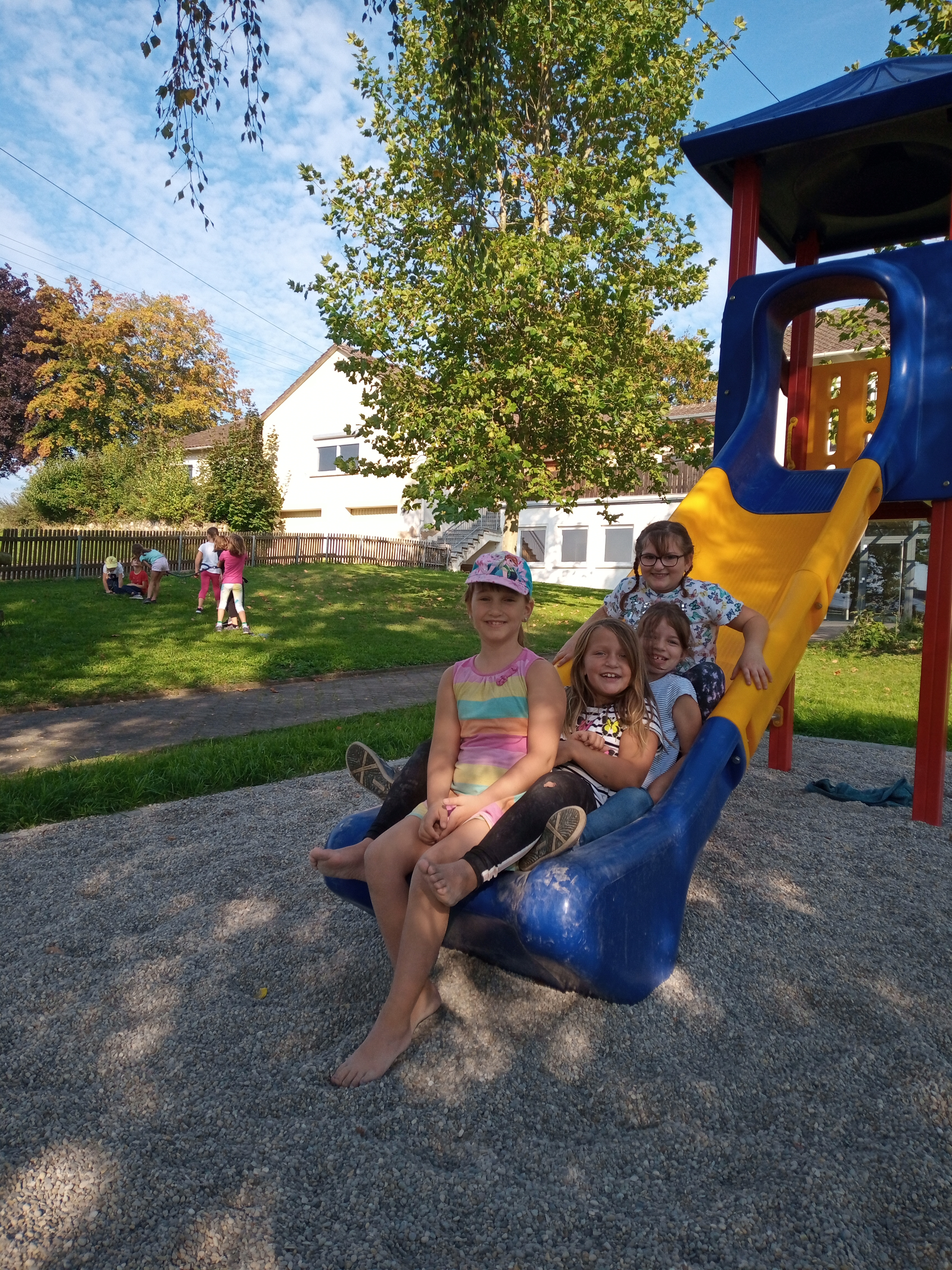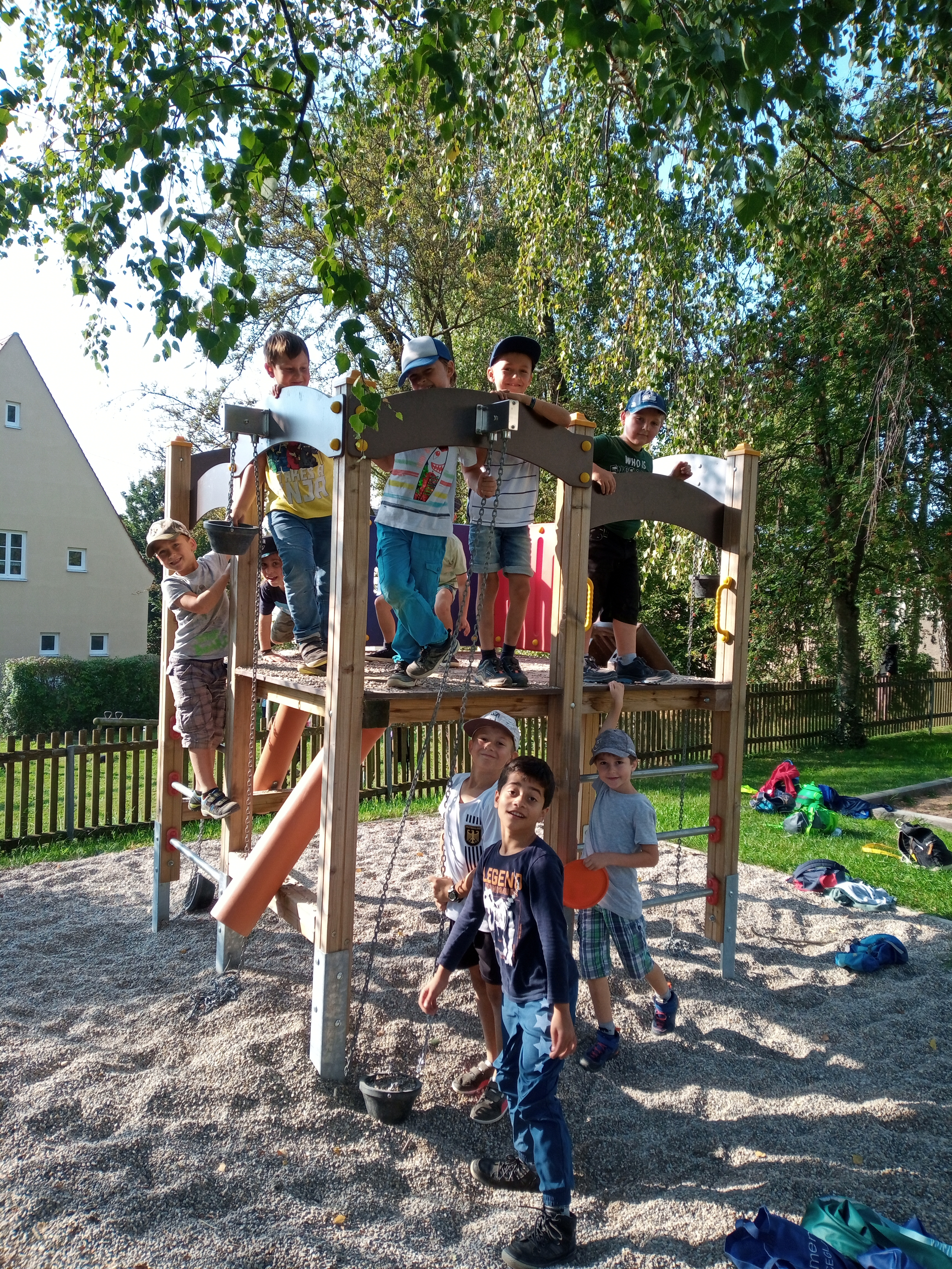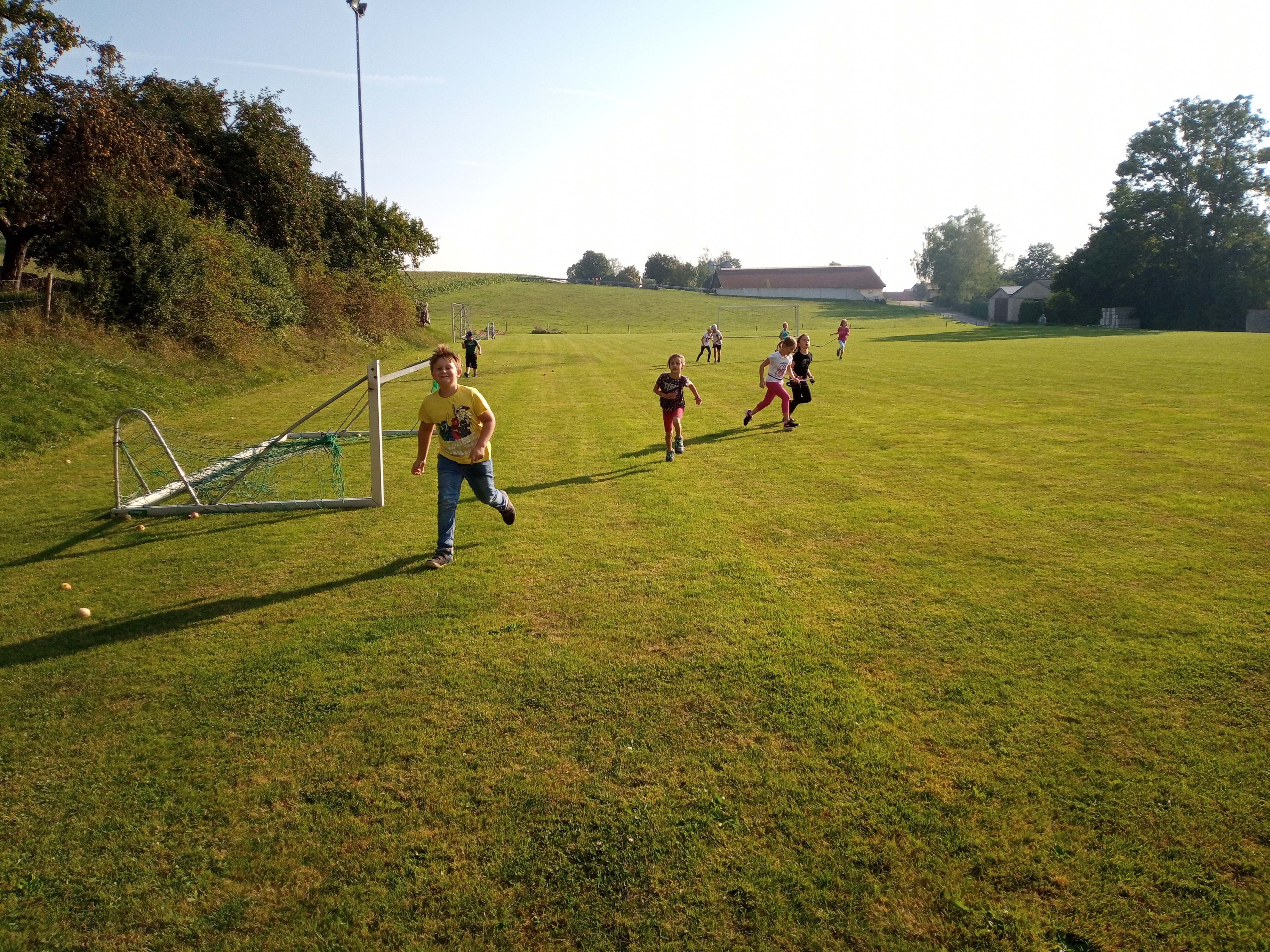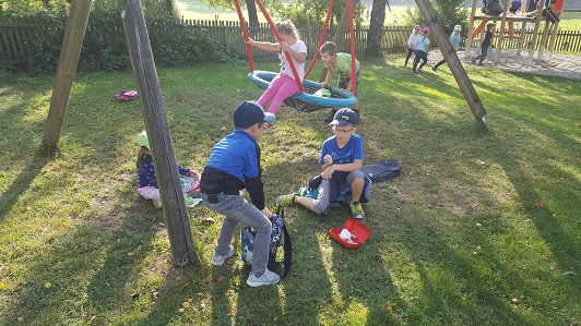 Bei bestem Wetter ging es für die beiden ersten Klassen gemeinsam - wenn auch mit Abstand hintereinander - nach Schopflohe. Über den Urlas wanderten wir am Morgen bestens gelaunt den längeren und anstrengenderen Weg hin zu unserem Ziel. Nacheinander durfte jede Klasse dann ausführlich beide Spielplätze ausnützen, in der Halbzeit wurde gewechselt. Natürlich durfte auch der Ball nicht fehlen, der große Sportplatz begeisterte alle Fußballer sehr. Über den Radweg ging es schließlich wieder zurück zur Schule. Wie schön, wenn sich wieder alle Kinder der Klasse sehen und alle miteinander spielen und lachen können!