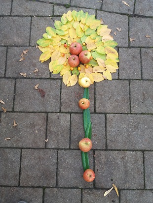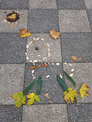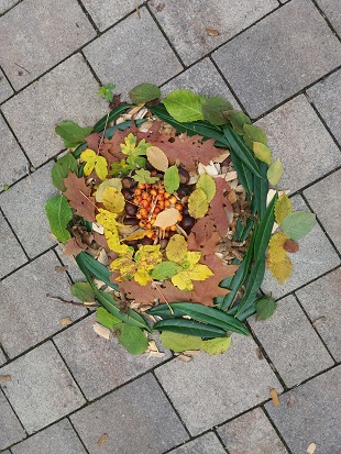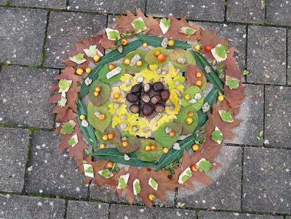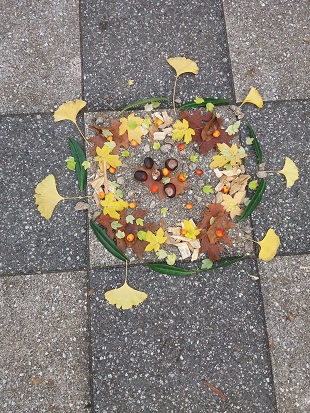 Der Herbst bietet so viele wundervolle Naturmaterialien. Da war es für die Viertklässler ein Genuss, draußen im Sonnenschein kreativ zu werden. Die Kunstwerke, die sie jeweils zu zweit in einer Unterrichtsstunde im Pausenhof gestaltet haben, können sich wirklich sehen lassen. Man nennt diesen Kunststil auch "LandArt".
