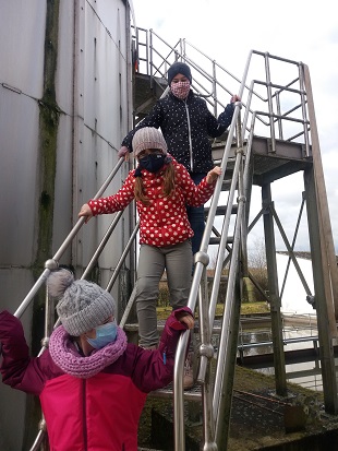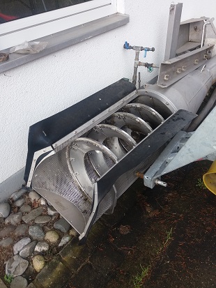 Vom Zufluss aus wird das Abwasser durch die Siebschnecke geleitet, wo das Papier und der Sand herausgefischt werden. Als Nächstes landet das Abwasser im Vorklärbecken. Darin ist eine Abtrennung, um das Fett und andere Schmutzteilchen vom Wasser zu trennen. In diesem Becken soll das Wasser ganz still liegen, damit der Schmutz auf den Boden sinkt. Es steigen dort Gase auf, so dass es Luftbläschen an der Oberfläche gab.