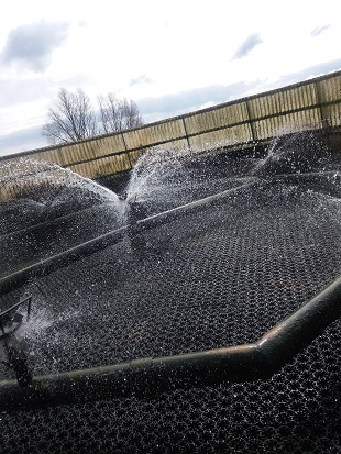 Anschließend fließt das Wasser in den Tropfkörper. Der ist mehrere Meter hoch und sieht wie eine Walze aus. Gefüllt ist er mit vielen löchrigen Plastikwaben. Oben sind riesige Rasensprenger angebracht. Über Rohre wird das Wasser ganz hoch zu den Sprengern weitergeleitet und dann wieder zurück in den Behälter gespritzt. So gelangt sehr viel Sauerstoff an das Wasser und es entstehen Bakterien, die noch mehr Schmutz - besonders die gelösten Stoffe - auffressen können.
