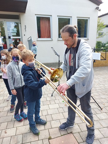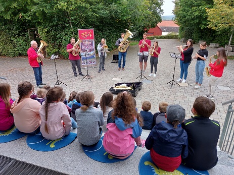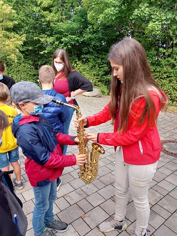 Gleich in der ersten Schulwoche besuchten mehrere Mitglieder des Musikvereins Fremdingen die Drittklässler, um ihnen Instrumente vorzustellen, die jetzt interessant wären, um nach Trommel und Flöte noch ein weiteres zu lernen. Zum Start gab es ein tolles Stück zum Anhören. Danach wurde jedes Instrument genau erklärt und vorgespielt. Zum Schluss konnten die Schüler auch mal ganz nahe ran, jedes anfassen und ihre Fragen stellen.