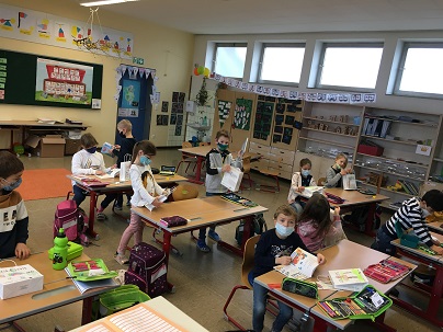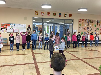 Alle Kinder lernen lesen, auch die Schülerinnen und Schüler der beiden ersten Klassen können mittlerweile recht selbst-ständig Wörter und schon kleine Texte lesen. Das war am 1. Februar Anlass einer kleinen Feier in der Aula der Grundschule. Die Erstklässler begrüßten dazu die Kinder aus der 2. Klasse mit ihrer Lehrerin Frau Wizinger mit dem Lied „Alle Kinder lernen lesen“. Diese hatten liebevoll bemalte Tüten der Stiftung Lesen für die Erstleser vorbereitet und übergaben sie persönlich. Die Erstklässler freuten sich sehr über diese Lesemotivation und schmökerten im Klassenzimmer gleich im geschenkt bekommenen Buch.