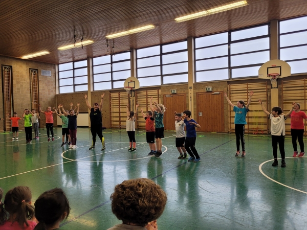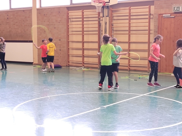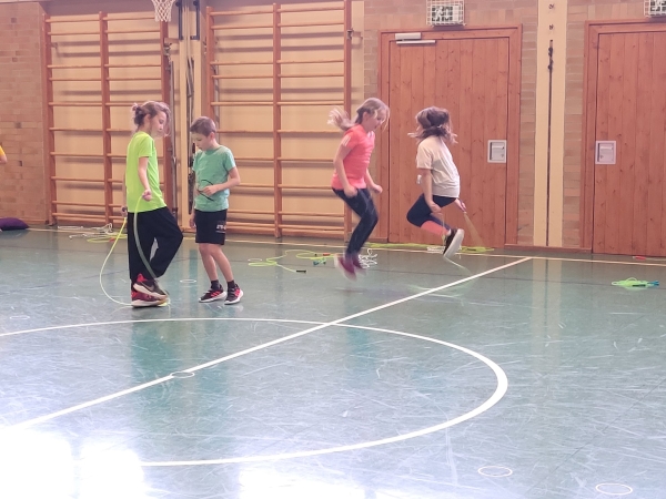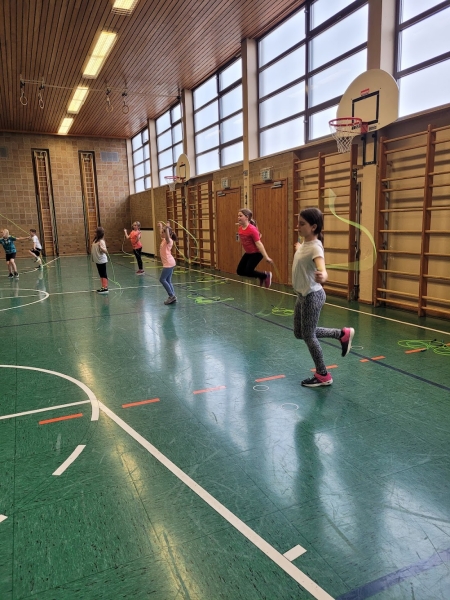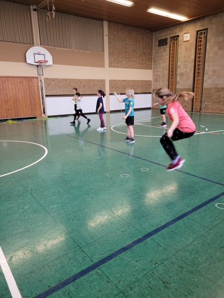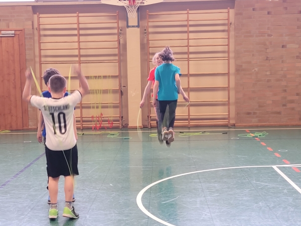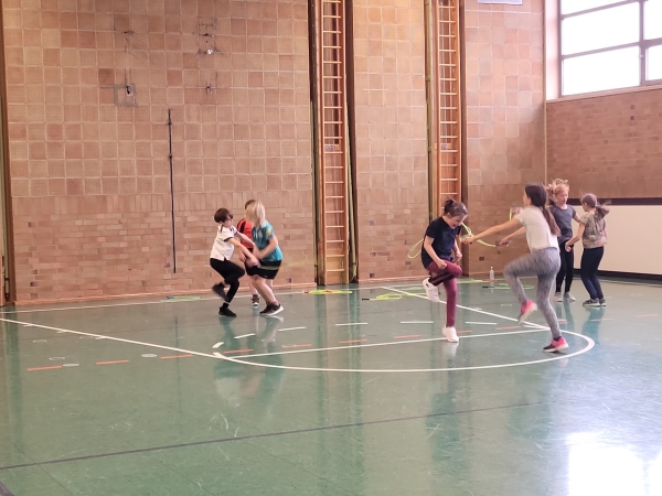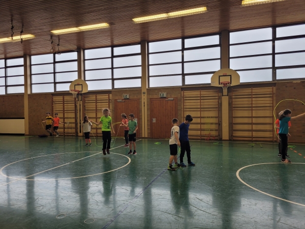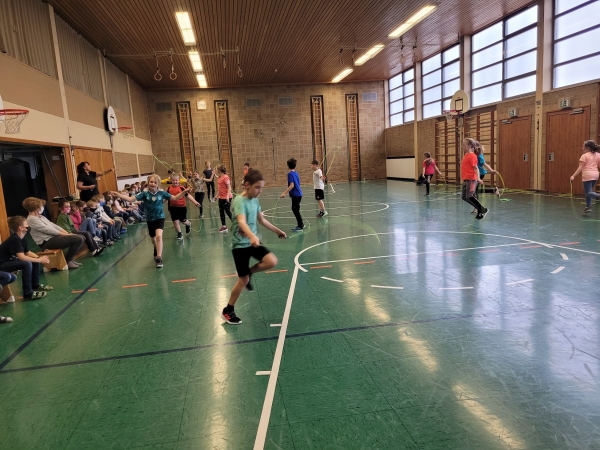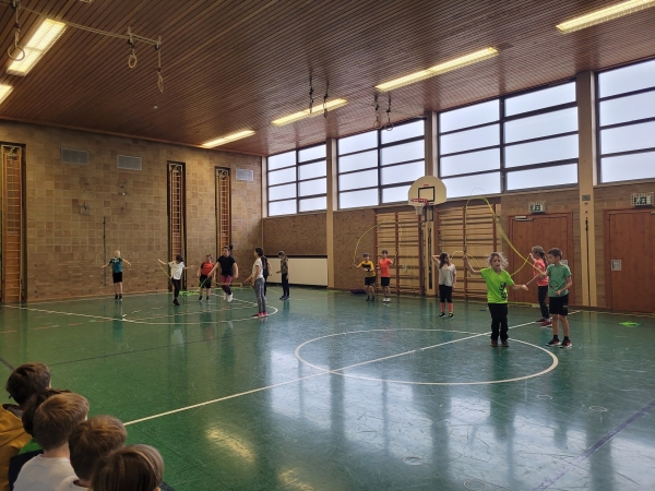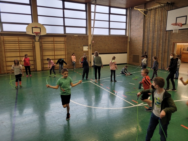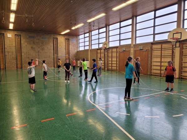 Da wir endlich wieder ohne Maske Sport machen dürfen, haben wir auch wieder einen Seilspring-Workshop von Skipping Hearts durchführen können. Frau Dehmel trainierte und übte mit den Kindern sehr motivierend neue Sprünge und am Ende konnten sie alles noch ihren Mitschüler in einer kleinen Darbietung vorführen. Die Schüler hatten sichtlich Spaß am Springen und haben sich sehr viel bewegt. Vielleicht springt ja der ein oder andere jetzt auch zu Hause mit dem Seil!