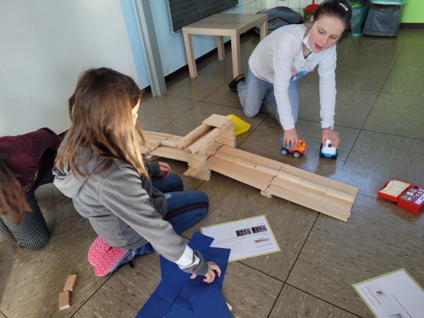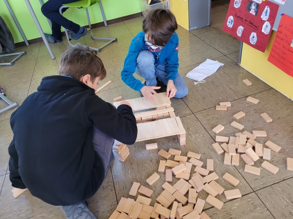 Die 4.Klasse hat sich mit dem Thema Bauen und Konstruieren von Brücken beschäftigt. Die Bilder zeigen Ergebnisse vom freien Bauen von tragfähigen Brücken.