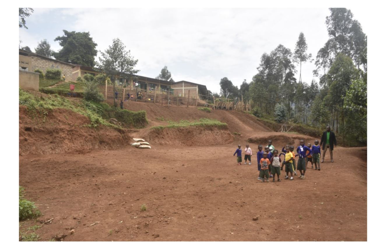 Auf dem Bild unten kann man das Grundstück für das neue Schulgebäude erkennen. Die Kinder helfen hier beim Ausmessen des Geländes.