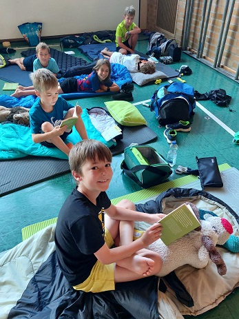 Für einen Abend und eine Nacht gehörte das Schulhaus der dritten Klasse mit ihren Lehrerinnen Frau Deißler und Frau Schenk. Die Kinder verbrachten zusammen wundervolle Stunden mit Lesen, Spiel, Essen und Basteln. Dazu nutzten sie den Pausenhof bei Sonnenschein, die Aula, die Küche, den Werkraum und natürlich die Turnhalle, in der sie übernachteten. Alle Schülerinnen und Schüler waren von den verschiedenen, abwechslungsreichen Aktionen begeistert und manch einer hätte gleich noch eine zweite Nacht bleiben wollen.