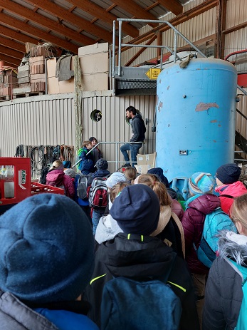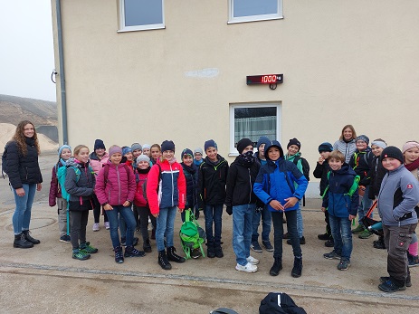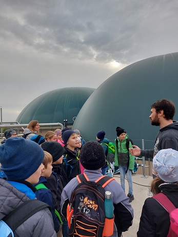 Die Viertklässler wanderten mit Frau Schröppel und Frau Deißler über Feld- und Wiesenwege zur Biogasanlage nach Minderoffingen, wo sie von Florian Michl, Mitbetreiber der Anlage, empfangen wurden. Erst wurde mal gewogen, so wie es auch bei jeder Anfahrt einer Fuhre Mais üblich ist: Genau 1 Tonne brachte die Klasse auf die Waage. Wie die Silage gelagert wird, sahen sie an den hohen Silobergen, die allerdings heuer eher niedrig sind und gerade so ausreichen werden. Die "Betonkuh" muss Florian täglich dreimal "füttern", damit ständig Gas produziert wird. Die sehr warme Masse in den großen Behältern durften die Schüler durch ein Fenster betrachten. Fast 70% des angelieferten Futters bleibt nach dem Gärprozess übrig und wird von den Bauern wieder als sehr beliebte Gülle für die Äcker abgeholt. Nicht nur Strom liefert die Anlage - so viel in einer Stunde, dass ein Haushalt ein Jahr damit versorgt wäre, sondern auch viele Häuser im näheren Umkreis profitieren von der Abwärme, die dabei entsteht. Mega laut war es in einem Raum, wo das Gas in Strom umgewandelt wird, aber klar, dass jeder da nur mit fest zugehaltenen Ohren reinspitzelte, falls er es wollte. Zum Abschluss gab es nach so vielen Informationen zur großen Freude aller noch eine süße Überraschung von Florian.