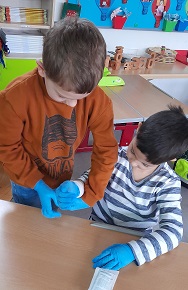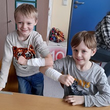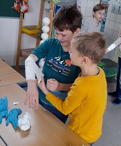 In der Praxis wurden dann kleinere Probleme konkret behoben, wie zum Beispiel Pflaster korrekt auf Wunden kleben (zugeschnitten und steril) oder einfache Verbände um Arme und Beine zu wickeln. Das gegenseitige Verarzten machten allen Kindern natürlich riesigen Spaß - und manch einer ließ Pflaster oder Verband sogar dran, um zuhause Mama und Papa zu erschrecken ... ![]()
