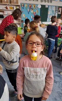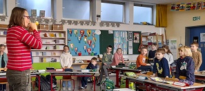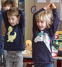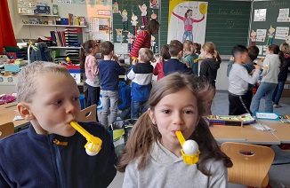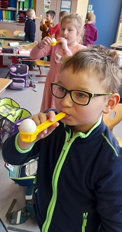 Am vergangenen Freitag haben auch wir Erstklässler mit unserer Forscher-Tätigkeit im Klasse 2000-Programm begonnen. In unseren vier Grundschuljahren versuchen wir jetzt herauszufinden, was wir selbst tun können, damit es unserem Körper in jeglicher Hinsicht gut geht. Wo Forscher am Werk sind, darf natürlich auch ein Forscherspruch nicht fehlen, mit dem wir von KLARO und unserer Gesundheitsförderin Frau Krebes ganz herzlich begrüßt wurden. Nach dem Motto „Gesund und fit, mach` du auch mit!“, machten wir uns gleich daran, den Weg der Luft in unserem Körper genau zu erkunden. Um die ausgeatmete Luft zu sehen, stand sofort ein Training mit dem „Atemtrainer“ auf dem Programm, den KLARO für uns als Geschenk mit im Gepäck hatte. Dass das richtige Atmen sehr entspannend sein kann, egal, ob man gerade wütend, aufgeregt und traurig ist oder bei den Hausaufgaben nicht weiterkommt, wurde mit Hilfe erlernter Atemtechniken wie z.B. Schlangenatmung, Gorillaatmung, Bienenatmung oder Holzfälleratmung gleich ausprobiert.