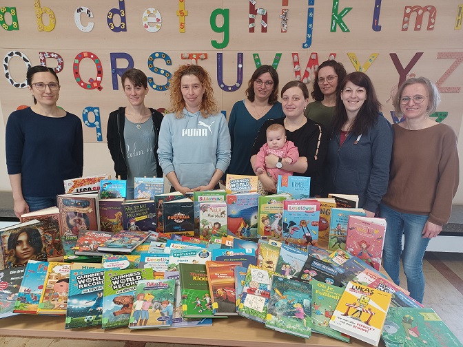 Um unseren Schülern immer aktuelle Kinderliteratur anbieten zu können und die Lust aufs Lesen zu wecken (bei vielen auch schon zu erhalten), haben wir wieder neue Bücher angeschafft. Bei der Auswahl unterstützte uns Frau Pflanz aus der Oettinger Stadtbibliothek, die immer auf dem neuesten Stand ist und uns viele Neuheiten für alle Jahrgangsstufen ausgesucht hat. Die Bücher konnten von Spendengelder gekauft werden und dank der tatkräftigen Unterstützung des Elternbeirats waren sie auch schnell mit einem Schutzumschlag eingebunden. Auf dem Bild ist eine kleine Auswahl zu sehen und unser Elternbeirat. Vielen Dank an alle Spender und an den Elternbeirat für die Hilfe.