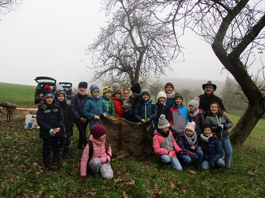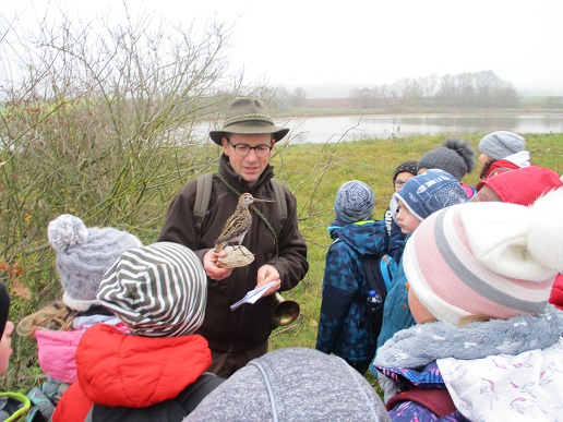 Am Freitag, den 22. November durfte die 3. Klasse mit ihrer Lehrerin Frau Deißler nahe Seglohe einen ganz besonderen Schulvormittag erleben. Herr Vogelsang, Papa eines Schülers, bot sich dazu an und war dafür auch besonders geeignet, denn als Jäger konnte er die Kinder in vielerlei Hinsicht für Tier, Natur und Umwelt begeistern und sensibilisieren. Staunend lauschten sie dem Jagdhorn, das zu Beginn einer jeden Jagd ertönt. Viele bekannte wie seltene Tierarten konnten die Schüler mit seinen Ferngläsern am Segloher Weiher bestaunen. Raffiniert hatte Herr Vogelsang ausgestopfte Vögel "versteckt", wie die Bekasine, um sie dann genauer in Augenschein nehmen zu können. Bei einem aufwärmenden Kinderpunsch und Butterbreze am knisternden Lagerfeuer erfuhren sie vieles über das Wildschwein, dessen Kopf zwei Buben in die Höhe stemmten.